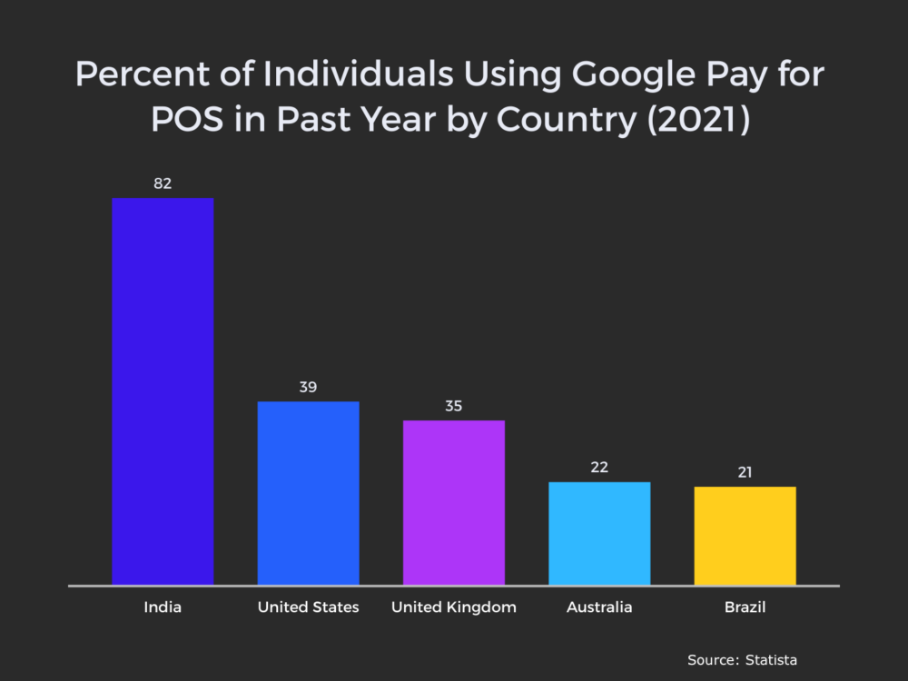 Android is the world’s most popular operating system, with over 2.5 billion active users (Statista). Google Pay is a digital wallet and online payment system that’s especially popular in India, the United States, and across Europe. (Statista). Google Pay allows users to make payments with Android phones, tablets or watches. Users can also pay via web browsers on desktop and iOS. See the graph below based on Statista Research data.