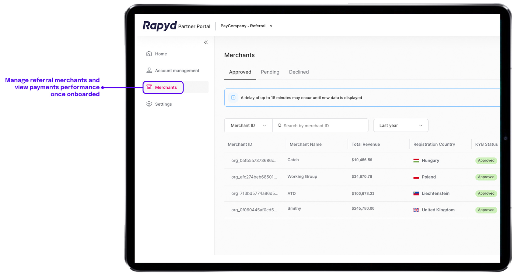 Partners onboard merchants using the same verification infrastructure used by Rapyd to onboard its direct merchants, and can manage their portfolio by gaining visibility into their merchants’ Client Portal view. Referral partners drive new opportunities and track referral performance by tapping into Rapyd’s proprietary performance data. The Dashboard App pulls the same performance data as that of the Client Portal.