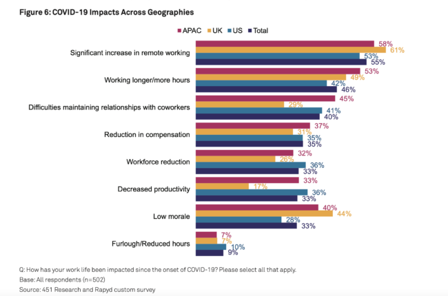COVID-19 posed professional, personal and financial challenges for developers, including working longer, difficulties maintaining coworker relationships, and dealing with a workforce reduction. Our survey also revealed interesting differences between regions. This change was more noticeable for the developers in the UK, where 44% of respondents noted poor morale. The US on the other hand did a better job of maintaining employee satisfaction, with only 28% reporting poor morale.