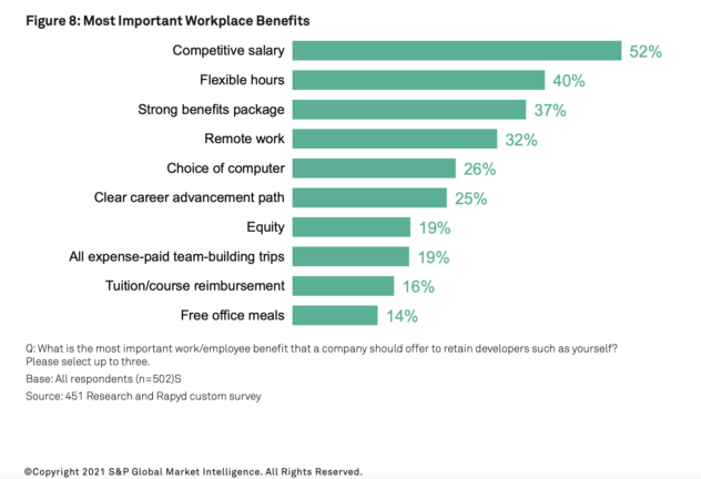 Another crucial factor in employee satisfaction was good job benefits. When asked, “What is the most important work/employee benefit that a company should offer to retain developers such as yourself?”, the most desired benefits were not perks but rather competitive salaries (52%), flexibility (40%), and good benefits (37%).