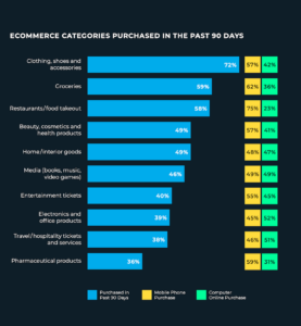 The Spanish ecommerce market sees frequent clothing and accessory purchases (72%), followed by groceries (59%) and food (58%). Most consumers bought restaurant takeout (75%) and groceries (62%) via mobile, while less frequent purchases like electronics (52%) and travel products (51%) were mostly purchased via desktop in Spain.