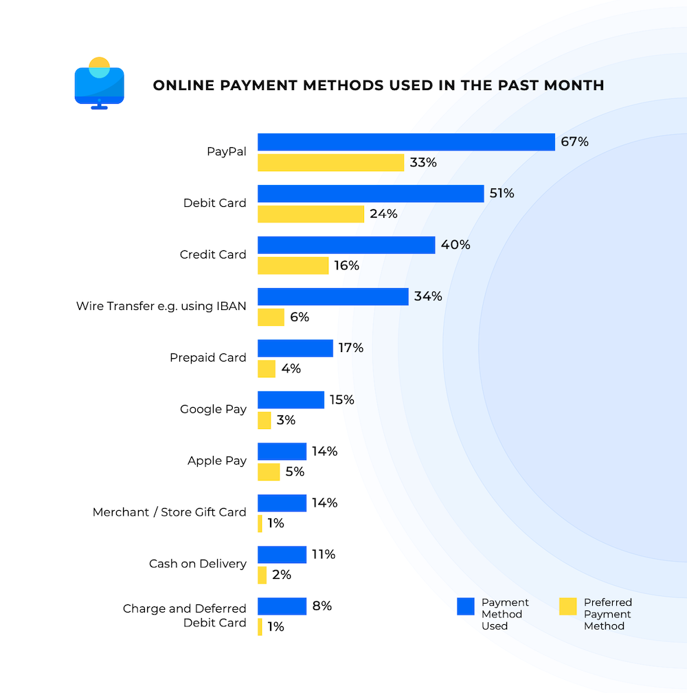 PayPal leads the way for online payment methods in Spain with 67% of respondents recently using it for online checkout. This is followed by cards, another popular choice for Spanish shoppers, with 51% using credit and 40% using debit for recent online purchases. eWallets, Apple Pay and Google Pay are also gaining in use, with 15% and 14% of people in Spain reporting recently using them online. One-third of respondents pick PayPal as their first-choice method, while 24% choose debit cards.