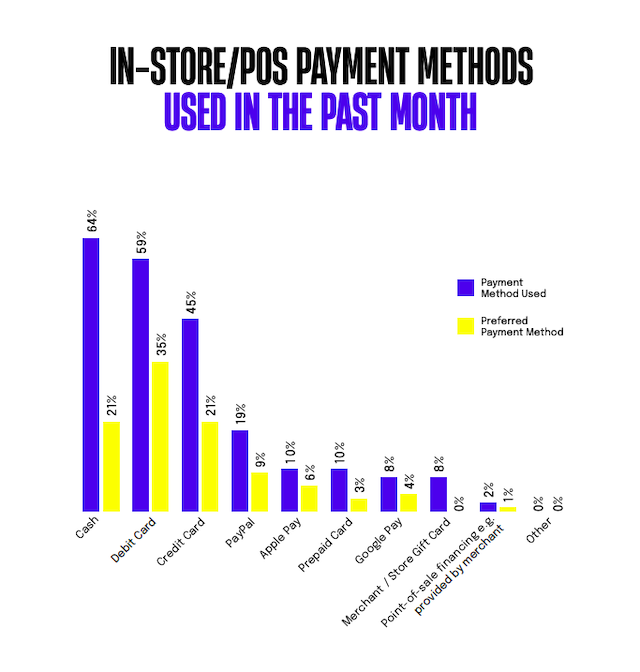 While 64% of respondents used cash for recent in-store purchases, only 21% consider it their first-choice payment method. In Spain, a little more than one-third (35%) of respondents’ first preference is a debit card, with credit cards as the next most popular choice. For digital wallets, 9% selected PayPal as their preferred payment method, while 6% chose Apple Pay.