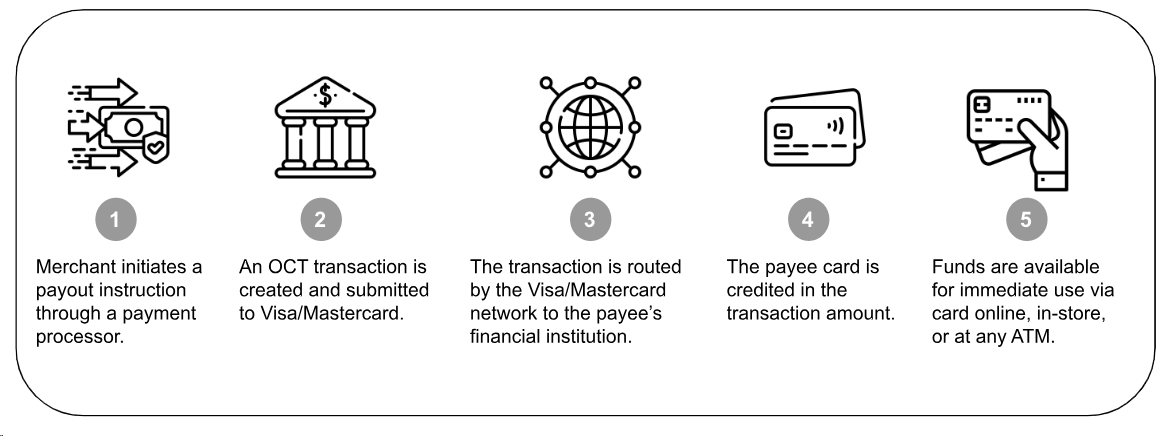 Original Credit Transaction (OCT) is a direct payout method that has long been leveraged by merchants to issue refunds. Card payouts are a further productization of the OCT capability that extend the application of the refund use case for global payouts at large. It is a type of push payment that directs funds from a payment service provider to a cardholder account. Through card payouts, platforms can push payments to cards rather than exclusively to bank accounts – a process that delivers the value of speed via a faster time to payout.