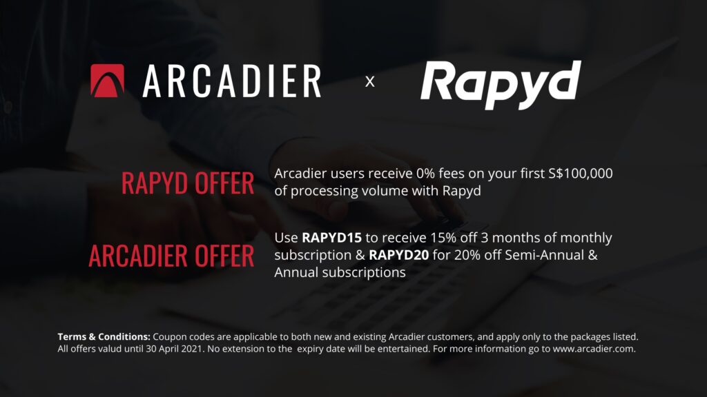 As part of the global partnership launch, Arcadier and Rapyd are providing limited-time special offers. Arcadier users are eligible to receive 0% fees on their first S$100,000 of processing volume, valid now through 30 April 2021 and for Asia-based customers. Likewise, all Rapyd customers interested in building a marketplace are eligible to receive 15% off their first 3-month subscription using the code ‘RAPYD15’, or 20% off semi-annual and annual subscriptions using the code ‘RAPYD20’ at Arcadier. For the complete details of the offers, visit https://www.arcadier.com/learn/affiliate-details/rapyd.