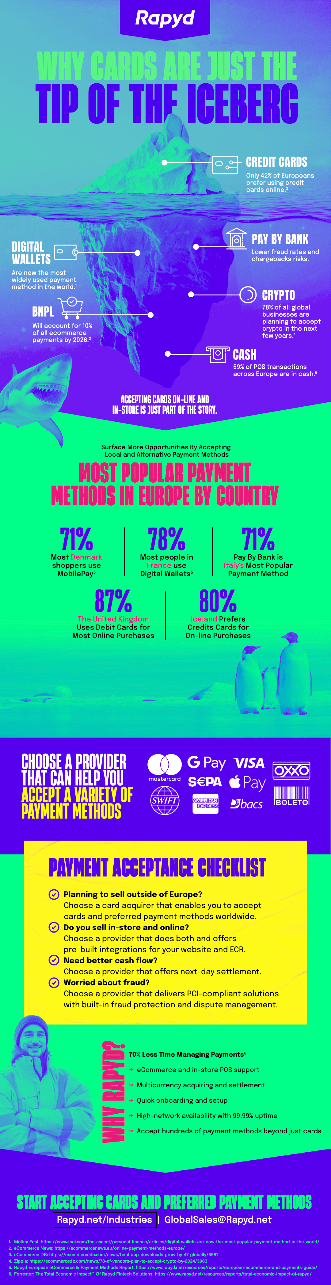 An infographic with stats and charts that show that alternative payment methods like eWallets are gaining popularity in Europe.